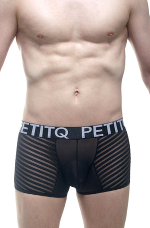 Volltransparenter schwarzer Shorty für Herren: Material mit transparenten Streifen und transparenter Tasche.