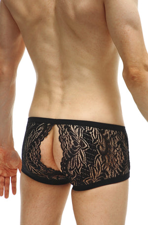Black lace boyshorts with open backs for wild nights out. Seamless front pouch for a nude-like look. Also available in white.