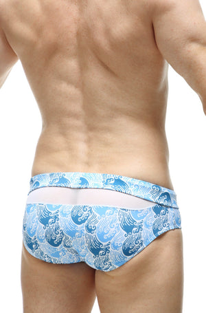 White swim briefs with small blue waves. White transparent section on the top of the buttocks to show just enough!