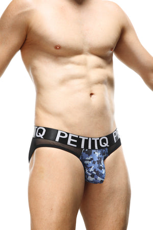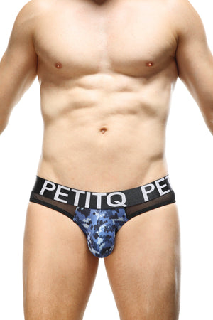 Sheer black briefs in fine stretch mesh with a modal thong shape to cover up just the right amount. Featuring a pixelated blue camouflage print.