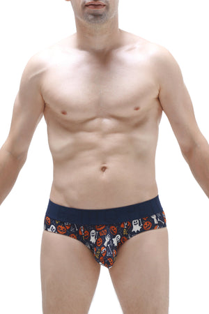 Fun Halloween briefs with a pumpkin and ghost print. Seamless front pouch.
