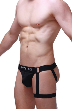 Le Jockstrap Prenay PetitQ en noir reprend la base athlétique du modèle Paudy et y ajoute un détail d'élastique sur la cuisse pour un look plus distinctif et "harnais".