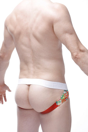 Un jockstrap pour Noël ? On dit oui ! Ceinture blanche, Imprimé de petits bonhommes de neige et sapins comme un paquet cadeau.