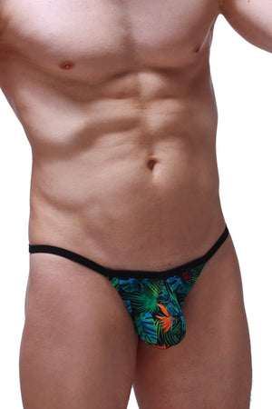 Ce string se distingue par sa poche frontale souple en nylon ornée d'un motif tropical saisissant. L'arrière est conçu comme un T-back (ficelle) ultra-minimaliste. Il assure une couverture minime à l'arrière, tout en offrant un galbe original et coloré à l'avant.