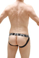 Jockstrap en modal blanc avec ceinture et coutures noires. A l'avant double poche pour y glisser une coque en mousse.